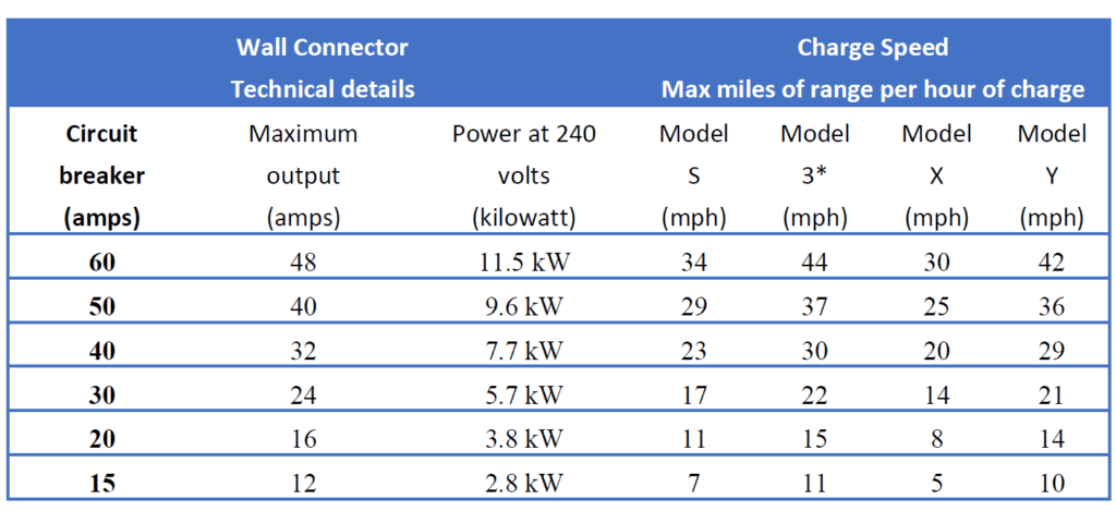 Probably obvious, but the faster your charge rate the more power it takes. Let’s take a look at a Tesla charge rate and amperage chart using a tesla wall connector for reference.